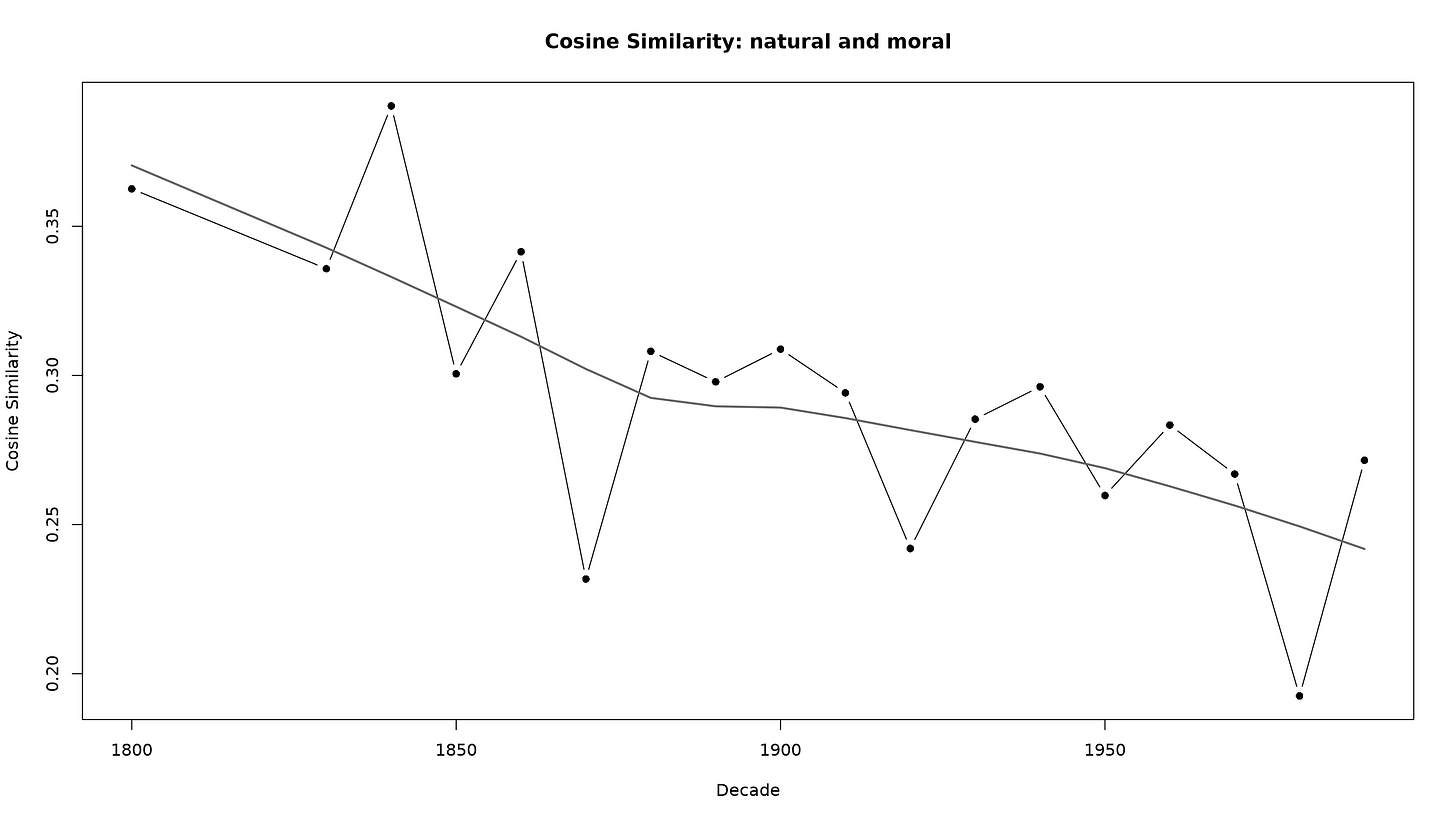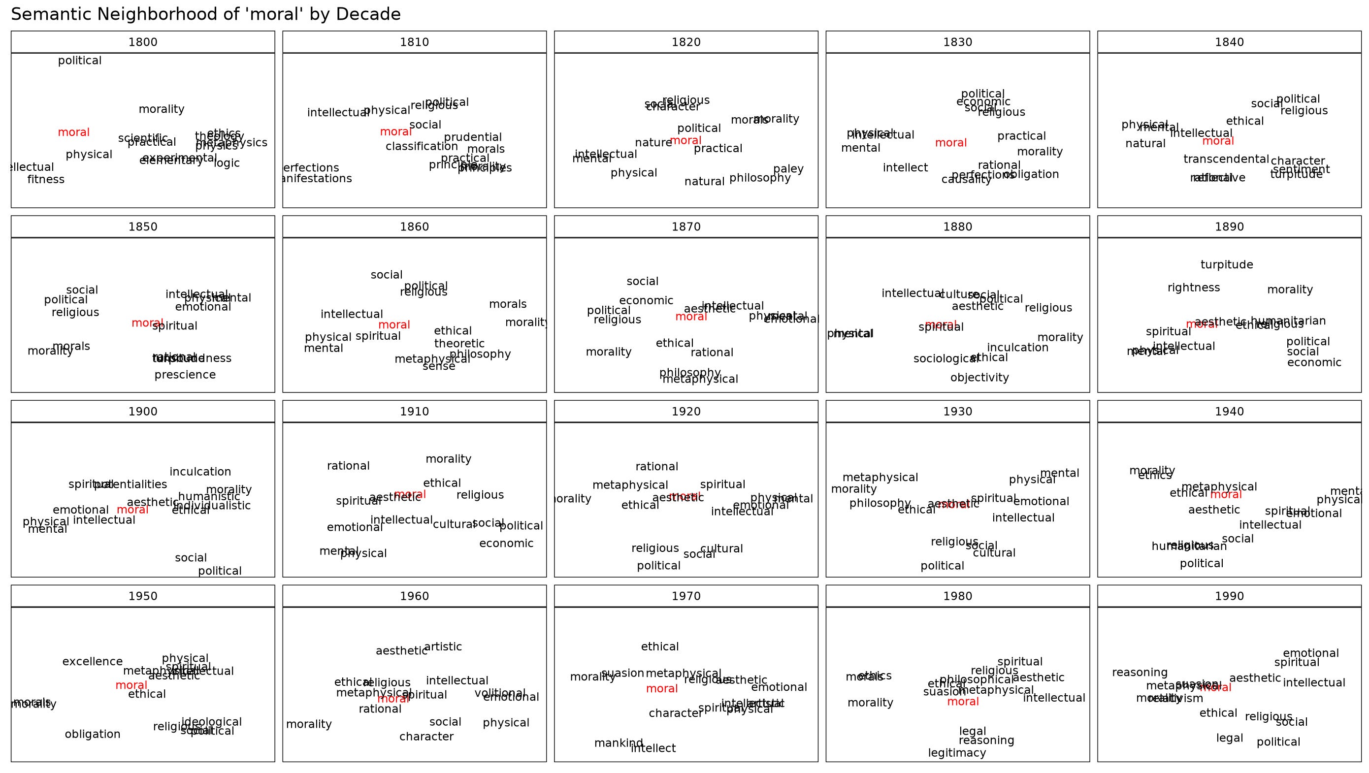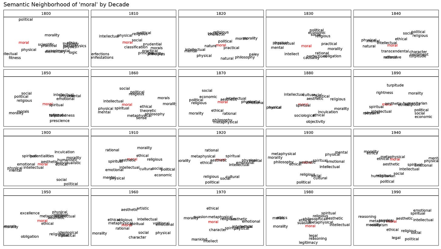 I stitched together decade models from the HistWords: Word Embeddings for Historical Text to see how the meaning of “moral” has changed each decade since 1800.