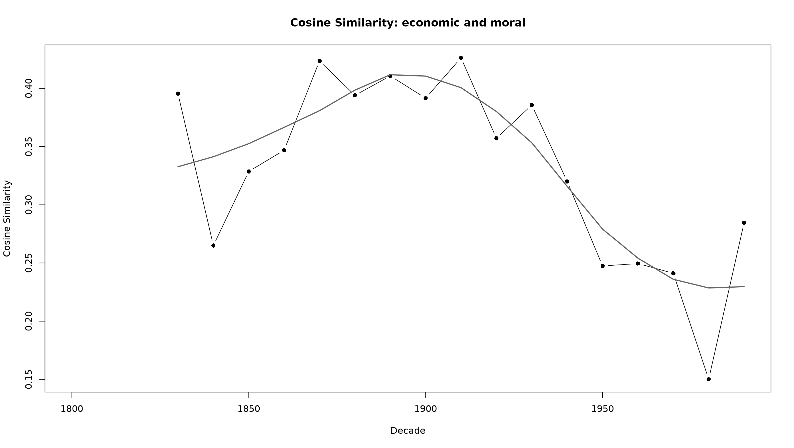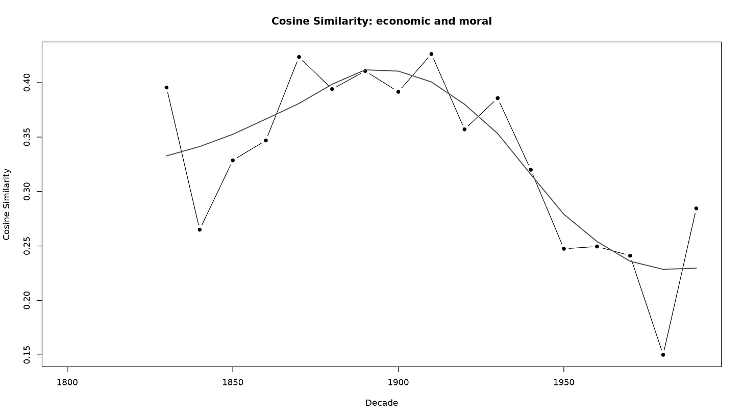 Not so fast! What we see is a kind of convergence around 1900 between the two concepts. This was a moment when economic life was morally contested. Many modern nations, even in Europe, were coming into being. Were they to be socialistic or capitalistic? After this period the decline reflects a modern split between technical-economic reasoning and ethical evaluation—a key concern for thinkers from Weber to Polanyi.