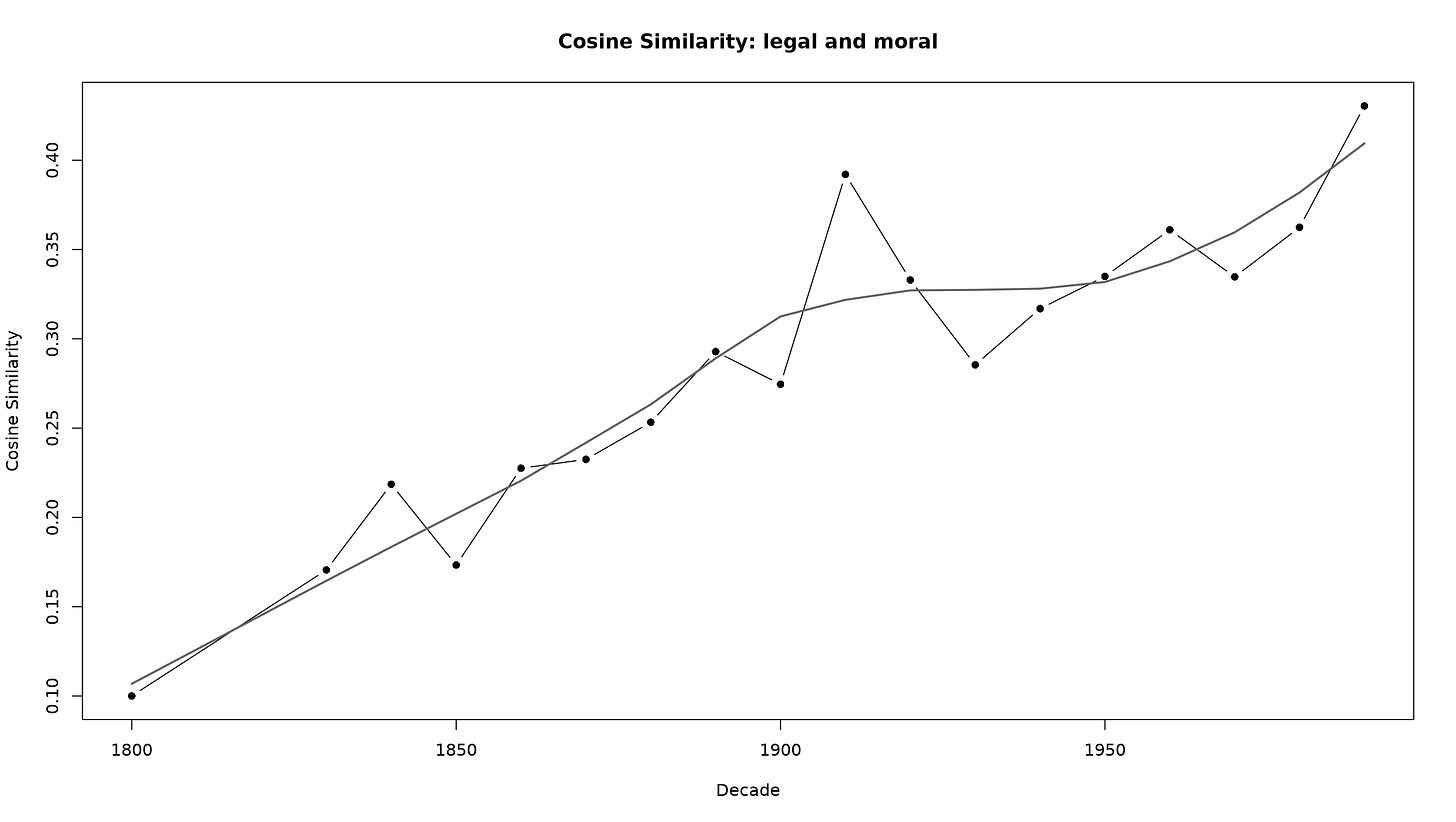 These kinds of charts are fun to look at. It’s like a “Where’s Waldo” of the humanities. Do you have any theories? Any hypotheses? Here’s one of mine: moral reason has become more legalistic. So, let’s test that. Below is the chart of the semantic similarity between “moral” and “legal” over the past 200 years: