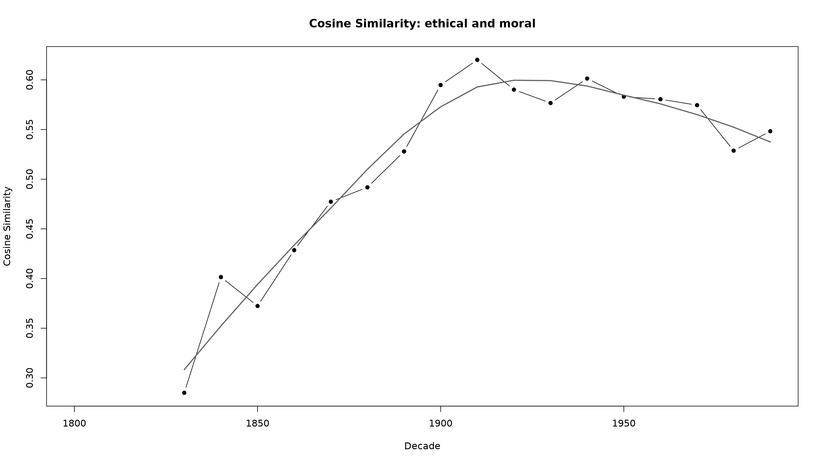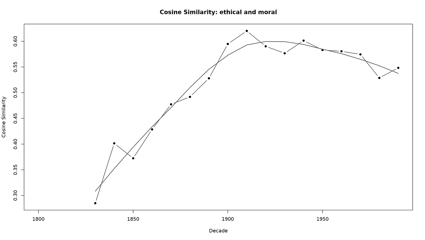 Anyway, here are the words that share the most similarity to the term “moral” each decade since 1800: